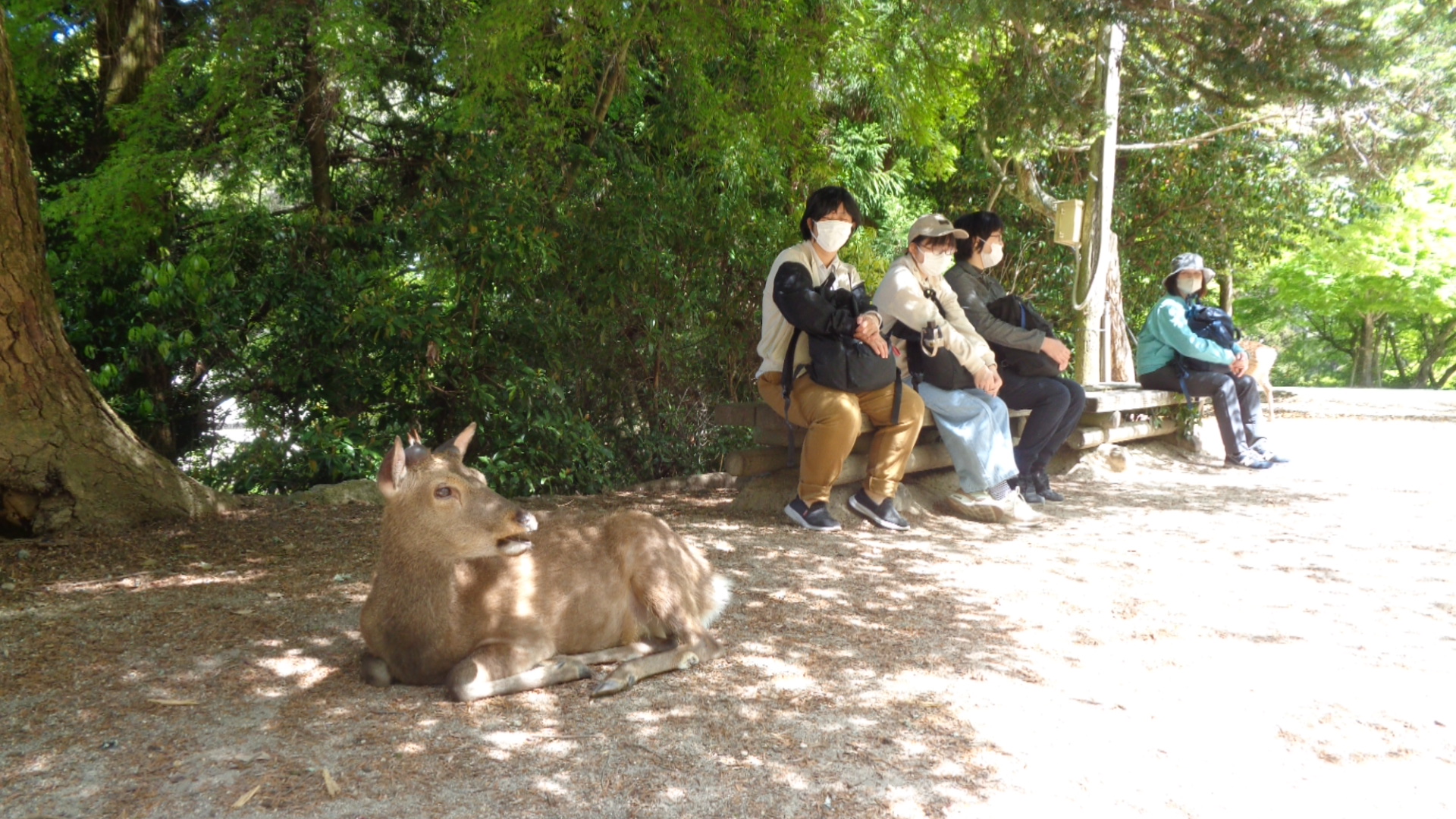 4月19日(金)に春レクで宮島に行きました 各自宮島口に集合して、フェリーに乗って宮島に渡りました。 宮島のフェリー乗り場を出たところで集合写真を撮りました。 大鳥居をバックに撮りました。 五重塔を見上げるアングルで撮りました。 藤の棚公園で休憩しました。 大元公園で昼食を摂りました。 昼食後は、3グループに分かれて行動しました。厳島神社グループです。 水族館グループです。 商店街グループです。 好天に恵まれ、楽しい一日を世界遺産の宮島で過ごすことができました。訓練生同士、訓練生と職員のつながりが深まりました。