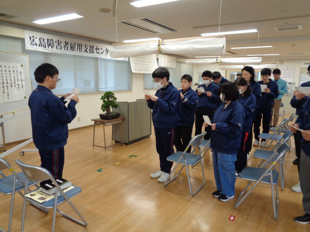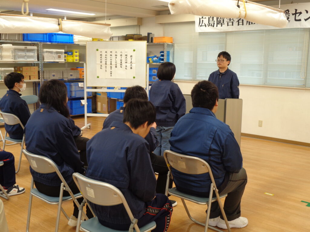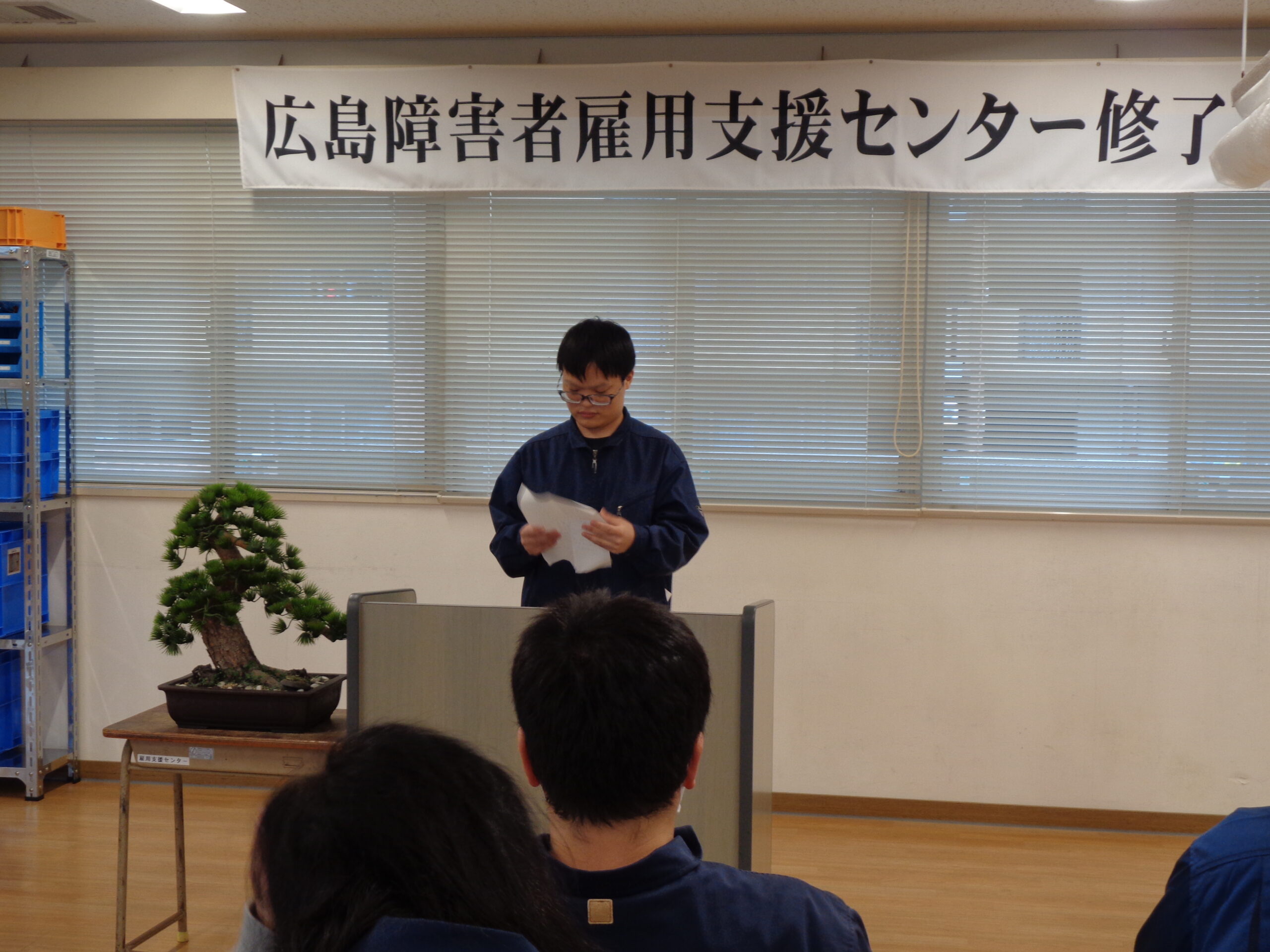 修了生からお礼の言葉がありました。心に残った作業訓練、楽しかったレクリエーション、訓練生や職員へのお礼、就職する会社で頑張ることをとても上手にまとめて話されました。