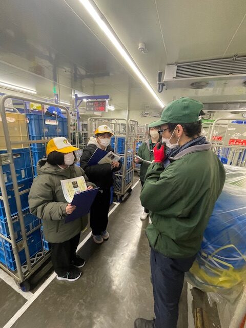 安佐北区の物流センター倉庫で働いている修了生が説明をしてくれています。先輩の説明を一生懸命に聞いています。